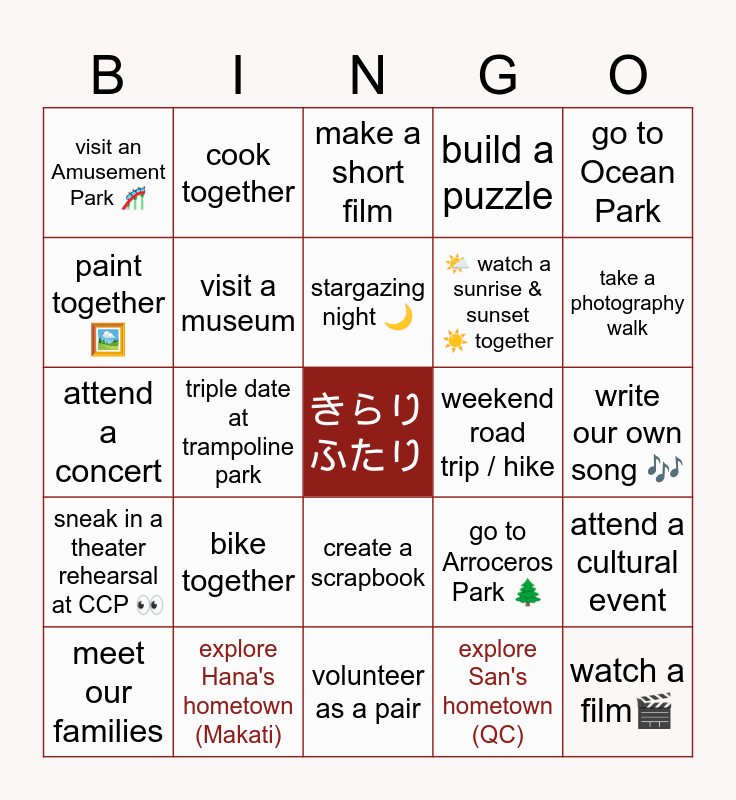 This bingo card has a free space and 24 words: meet our families, bike together, stargazing night 🌙, explore San's hometown (QC), go to Ocean Park, visit an Amusement Park 🎢, cook together, make a short film, weekend road trip / hike, write our own song 🎶, attend a concert, visit a museum, go to Arroceros Park 🌲, attend a cultural event, paint together 🖼️, explore Hana's hometown (Makati), volunteer as a pair, build a puzzle, take a photography walk, sneak in a theater rehearsal at CCP 👀, triple date at trampoline park, create a scrapbook, 🌤️ watch a sunrise & sunset ☀️ together and watch a film🎬.