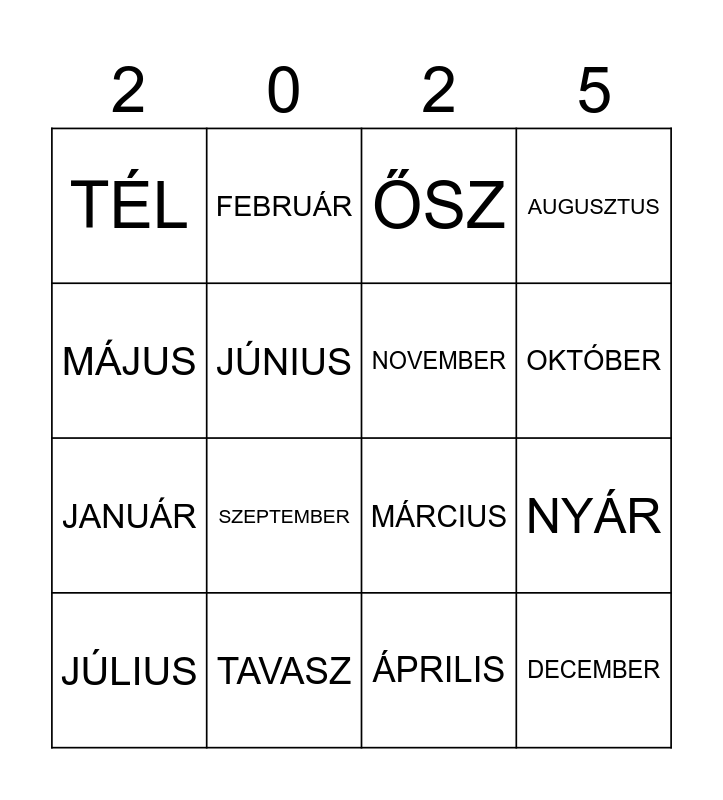 This bingo card has 16 words: TAVASZ, NYÁR, ŐSZ, TÉL, JANUÁR, FEBRUÁR, MÁRCIUS, ÁPRILIS, MÁJUS, JÚNIUS, JÚLIUS, AUGUSZTUS, SZEPTEMBER, OKTÓBER, NOVEMBER and DECEMBER.