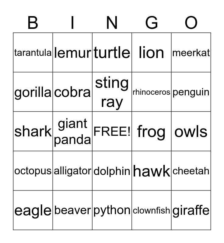 This bingo card has a free space and 24 words: alligator, beaver, sting ray, eagle, meerkat, tarantula, gorilla, lemur, frog, dolphin, rhinoceros, shark, hawk, cheetah, cobra, clownfish, owls, turtle, penguin, giant panda, giraffe, octopus, lion and python.