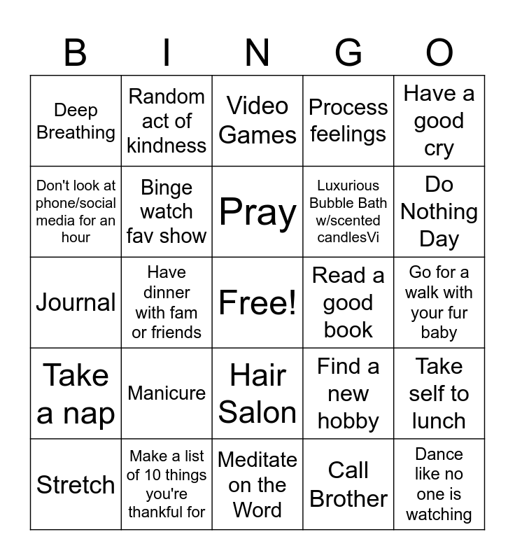 This bingo card has a free space and 24 words: Manicure, Make a list of 10 things you're thankful for, Pray, Stretch, Have a good cry, Deep Breathing, Don't look at phone/social media for an hour, Random act of kindness, Read a good book, Hair Salon, Luxurious Bubble Bath w/scented candlesVi, Journal, Find a new hobby, Take self to lunch, Binge watch fav show, Call Brother, Go for a walk with your fur baby, Video Games, Do Nothing Day, Have dinner with fam or friends, Dance like no one is watching, Take a nap, Process feelings and Meditate on the Word.