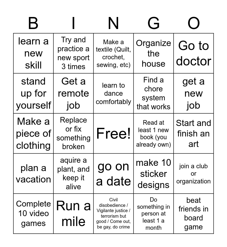 This bingo card has a free space and 29 words: Complete 10 video games, Finish reading a genre of books on your shelf (Comics, horror, YA, etc), Replace or fix something broken, Go to the dentist, learn a new skill, Make a textile (Quilt, crochet, sewing, etc), Get a remote job, aquire a plant, and keep it alive, Read at least 1 new book (you already own), Run a mile, Start and finish an art, beat friends in board game, Civil disobedience / Vigilante justice / terrorism but good / Come out, be gay, do crime, Do something in person at least 1 a month, get a new job, improve diet, go on a date, plan a vacation, Go to doctor, Make a piece of clothing, make 10 sticker designs, plan some hangout sessions, Find a chore system that works, stand up for yourself, Organize the house, Try and practice a new sport 3 times, join a club or organization, learn to dance comfortably and win a library bingo.