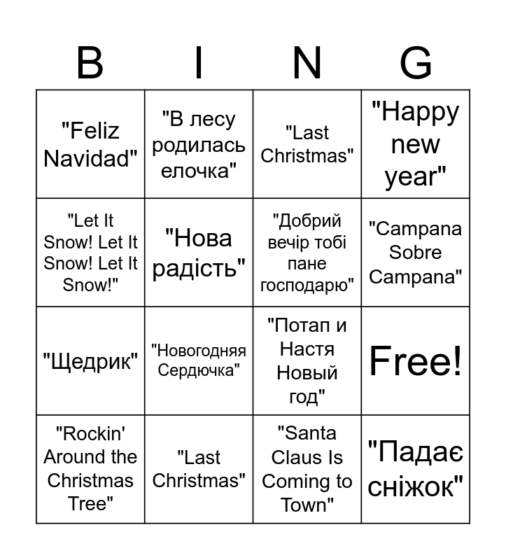 This bingo card has 20 words: Free!, "Jingle Bells", "Last Christmas", "All I Want for Christmas Is You", "Rockin' Around the Christmas Tree", "Let It Snow! Let It Snow! Let It Snow!", "Last Christmas", "Feliz Navidad", "Щедрик", "В лесу родилась елочка", "Новогодняя Сердючка", "Потап и Настя Новый год", "Нова радість", "Падає сніжок", "Добрий вечір тобі пане господарю", "Mi Burrito Sabanero", "Campana Sobre Campana", "Happy new year", "Santa Claus Is Coming to Town" and "Хай ісус мале дитя".