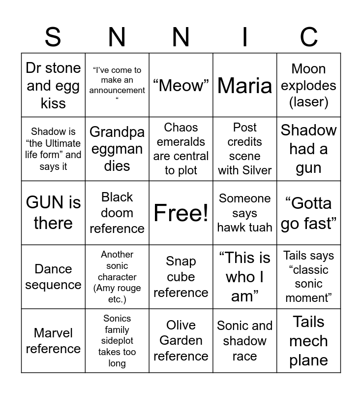 This bingo card has a free space and 24 words: Another sonic character (Amy rouge etc.), Sonics family sideplot takes too long, Chaos emeralds are central to plot, Marvel reference, Moon explodes (laser), Dr stone and egg kiss, Shadow is “the Ultimate life form” and says it, “I’ve come to make an announcement “, Someone says hawk tuah, Snap cube reference, Post credits scene with Silver, GUN is there, “This is who I am”, Tails says “classic sonic moment”, Grandpa eggman dies, Sonic and shadow race, “Gotta go fast”, “Meow”, Shadow had a gun, Black doom reference, Tails mech plane, Dance sequence, Maria and Olive Garden reference.