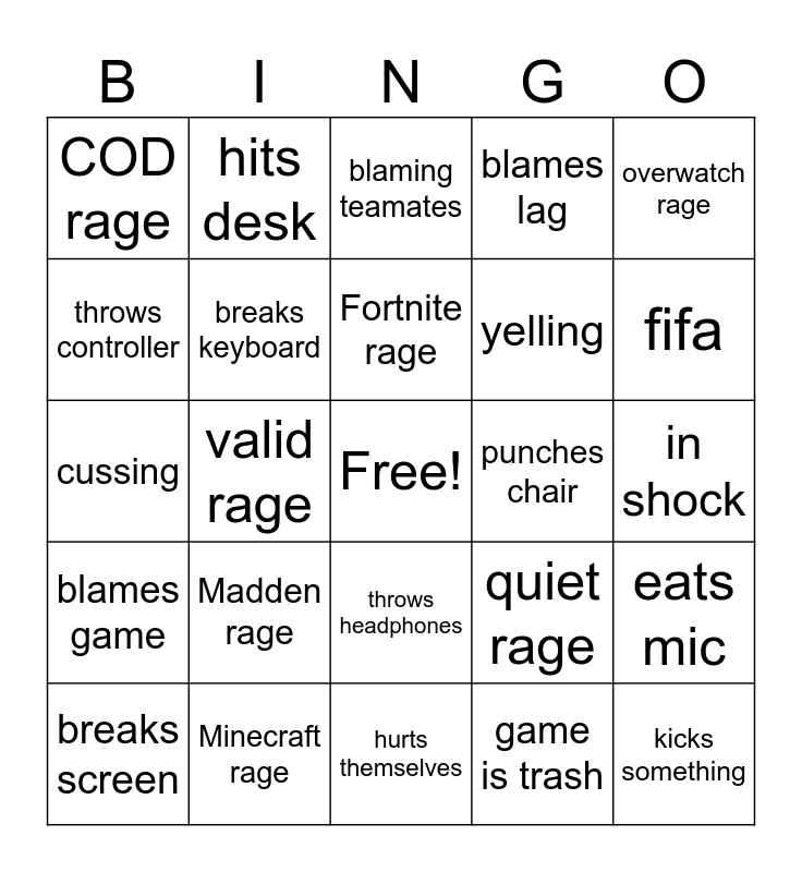 This bingo card has a free space and 24 words: Madden rage, Minecraft rage, Fortnite rage, breaks screen, overwatch rage, COD rage, throws controller, hits desk, punches chair, throws headphones, yelling, cussing, quiet rage, eats mic, breaks keyboard, game is trash, in shock, blaming teamates, fifa, valid rage, kicks something, blames game, blames lag and hurts themselves.