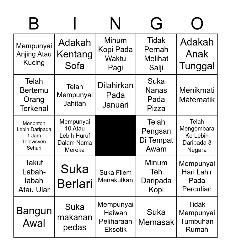 This bingo card has a free space and 33 words: Suka Berenang Atau Ski, Boleh Memainkan Alat Muzik, Mempunyai 10 Atau Lebih Huruf Dalam Nama Mereka, Tidak suka brokoli, Takut Labah-labah Atau Ular, Telah Mempunyai Jahitan, Adakah Anak Tunggal, Bangun Awal, Adakah Kentang Sofa, Boleh Bersiul, Dilahirkan Pada Januari, Minum Kopi Pada Waktu Pagi, Mempunyai lebih daripada 4 adik-beradik, Telah Memenangi Peraduan, Telah Pengsan Di Tempat Awam, Menikmati Matematik, Suka makanan pedas, Menonton Lebih Daripada 1 Jam Televisyen Sehari, Suka Berlari, Minum Teh Daripada Kopi, Suka Filem Menakutkan, Menikmati Sains, Mempunyai Anjing Atau Kucing, Telah Mengembara Ke Lebih Daripada 3 Negara, Mempunyai Haiwan Peliharaan Eksotik, Tidak Mempunyai Tumbuhan Rumah, Tidak Pernah Melihat Salji, Suka Nanas Pada Pizza, Telah Bertemu Orang Terkenal, Mempunyai Hari Lahir Pada Percutian, Telah terjun payung, Suka Memasak and Benci Memasak.