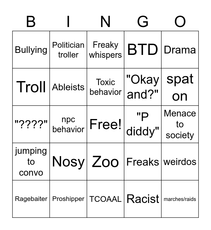 This bingo card has a free space and 24 words: Nosy, Proshipper, Toxic behavior, Ragebaiter, Drama, Bullying, Troll, Politician troller, "P diddy", Zoo, "Okay and?", "????", Freaks, weirdos, Ableists, Racist, Menace to society, Freaky whispers, spat on, npc behavior, marches/raids, jumping to convo, BTD and TCOAAL.