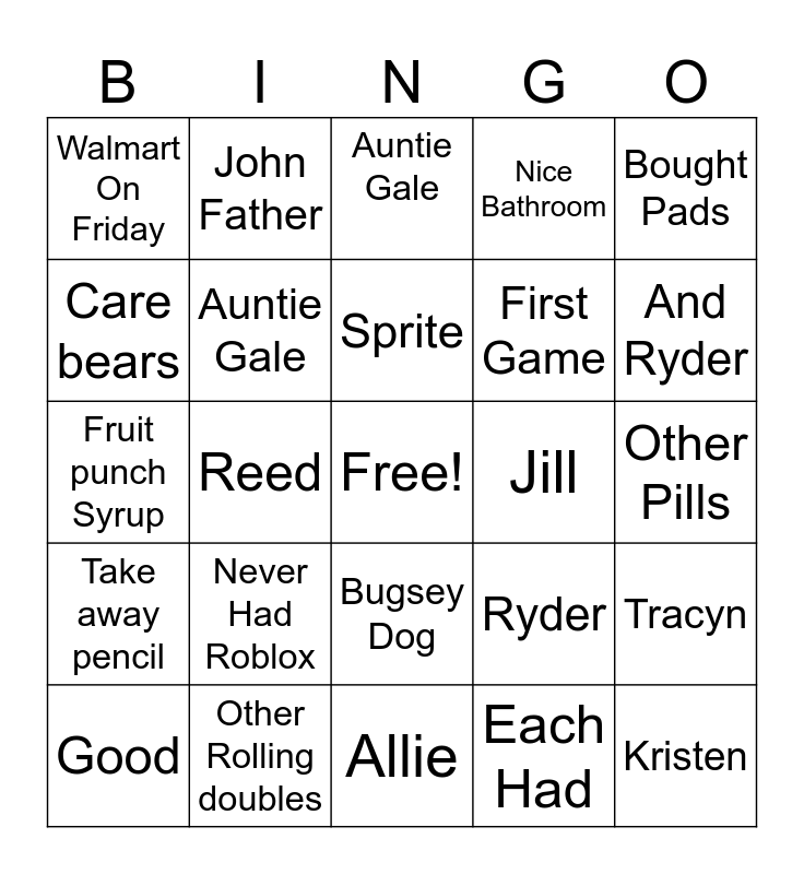 This bingo card has a free space and 79 words: December 17, Jamie, Auntie Gale, Went To Honolulu, Lihue Airport, Wheelchair, Potter, Walker, Auntie Gale House, Couch Bed, Tided Meeting, Tied Meeting For pinooer meeting, Nice Bathroom, Walmart On Friday, Potter Squishmallow, Care bears, Rolbox Gift Card, Never Had Roblox, Lactose Pills, Other Pills, Auntie Gale, Bought Pads, Fruit punch Syrup, Sprite, Auntie Gale, Couldn’t, Find Sherbet, We Went Game Stop, Get Rolbox Gift card, Riley, And Ryder, Cate, Allie, Was, Good, Jill, Party was Friday, Kinsley, Khole, Kristen, Myself, Jaylee, John, Jacob, Darnell, John Father, Esa, Micah, Allie, Cate, Tracyn, Reed, Ryder, Riley, Jill, Josten, Jamie, Auntie Gale, Uncle Wayne, Bugsey Dog, First Game, Muffin Tin Game ping pong Number, second One Was grab Marshmallows With candy cane, Second, Was One, With Paper, Pencil, 1 to 100, Rolling Double, Take away pencil, Other Rolling doubles, If the Reach 100, Stand Up Say Ho Ho, The other, Stand Up, Each Had, Fleeing, On Back and Was Snowman.