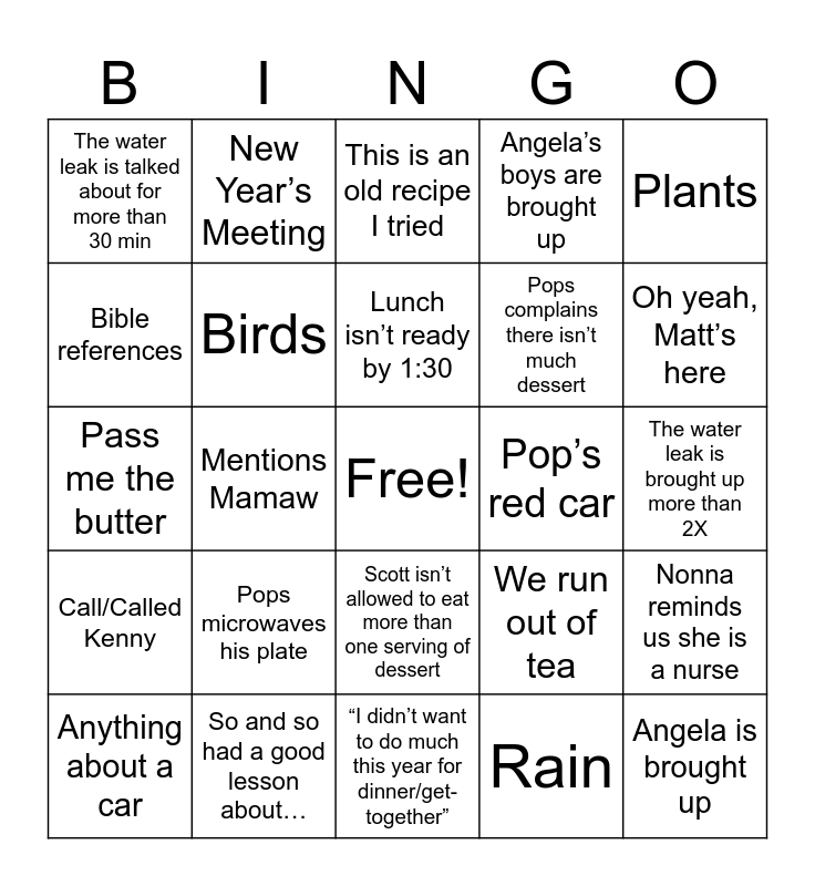 This bingo card has a free space and 34 words: Mentions “Pops will break it”, Rain, Leaking roof, Call/Called Mike, Call/Called Kenny, Birds, Plants, Anything about a car, New Year’s Meeting, Bow and Arrow, Lunch isn’t ready by 1:30, This is an old recipe I tried, Matthew can’t come, The new car, Pop’s red car, Oh yeah, Matt’s here, So and so had a good lesson about…, Pass me the butter, Pops microwaves his plate, We run out of tea, Scott isn’t allowed to eat more than one serving of dessert, The kids want to do something fun and are told “No”, The water leak is talked about for more than 30 min, The water leak is brought up more than 2X, “I didn’t want to do much this year for dinner/get-together”, Angela is brought up, Angela’s boys are brought up, Kristen wears house shoes, Pops complains there isn’t much dessert, Bible references, Mentions Papaw, Mentions Mamaw, Nonna reminds us she is a nurse and Hot rolls.