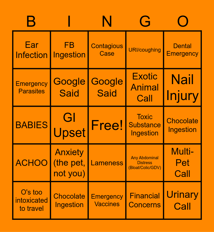 This bingo card has a free space and 26 words: Lameness, Financial Concerns, Google Said, Chocolate Ingestion, Dental Emergency, Ear Infection, Emergency Parasites, FB Ingestion, Chocolate Ingestion, Any Abdominal Distress (Bloat/Colic/GDV), Exotic Animal Call, BABIES, Multi-Pet Call, O's too intoxicated to travel, GI Upset, Laceration, URI/coughing, ACHOO, Contagious Case, Urinary Call, Nail Injury, Emergency Vaccines, Toxic Substance Ingestion, Anxiety (the pet, not you), Google Said and Owners Argue with Each Other.