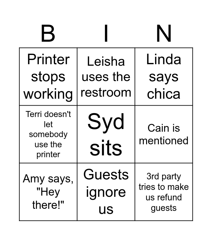 This bingo card has a free space and 8 words: Cain is mentioned, Linda says chica, Leisha uses the restroom, Amy says, "Hey there!", Printer stops working, 3rd party tries to make us refund guests, Terri doesn't let somebody use the printer and Guests ignore us.