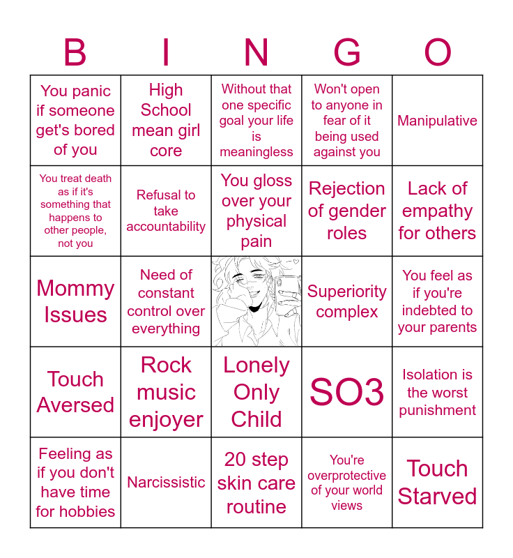 This bingo card has a free space and 24 words: Rock music enjoyer, Narcissistic, You gloss over your physical pain, Feeling as if you don't have time for hobbies, Manipulative, You panic if someone get's bored of you, You treat death as if it's something that happens to other people, not you, High School mean girl core, Superiority complex, Lonely Only Child, Rejection of gender roles, Mommy Issues, SO3, Isolation is the worst punishment, Refusal to take accountability, You're overprotective of your world views, You feel as if you're indebted to your parents, Without that one specific goal your life is meaningless, Lack of empathy for others, Need of constant control over everything, Touch Starved, Touch Aversed, Won't open to anyone in fear of it being used against you and 20 step skin care routine.