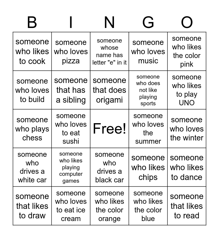This bingo card has a free space and 24 words: someone who likes playing computer games, someone who loves to eat ice cream, someone that does origami, someone that likes to draw, someone who likes the color pink, someone who likes to cook, someone who loves to build, someone who loves pizza, someone who loves the summer, someone who drives a black car, someone who does not like playing sports, someone who plays chess, someone who likes chips, someone who likes to dance, someone that has a sibling, someone who likes the color blue, someone who loves the winter, someone whose name has letter "e" in it, someone who likes to play UNO, someone who loves to eat sushi, someone that likes to read, someone who drives a white car, someone who loves music and someone who likes the color orange.