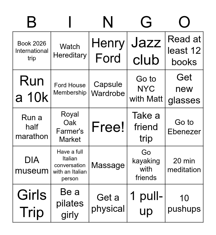 This bingo card has a free space and 24 words: Have a full Italian conversation with an Italian person, Be a pilates girly, Capsule Wardrobe, Girls Trip, Read at least 12 books, Book 2026 International trip, Run a 10k, Watch Hereditary, Take a friend trip, Massage, Go to NYC with Matt, Run a half marathon, Go kayaking with friends, 20 min meditation, Ford House Membership, 1 pull-up, Go to Ebenezer, Henry Ford, Get new glasses, Royal Oak Farmer's Market, 10 pushups, DIA museum, Jazz club and Get a physical.