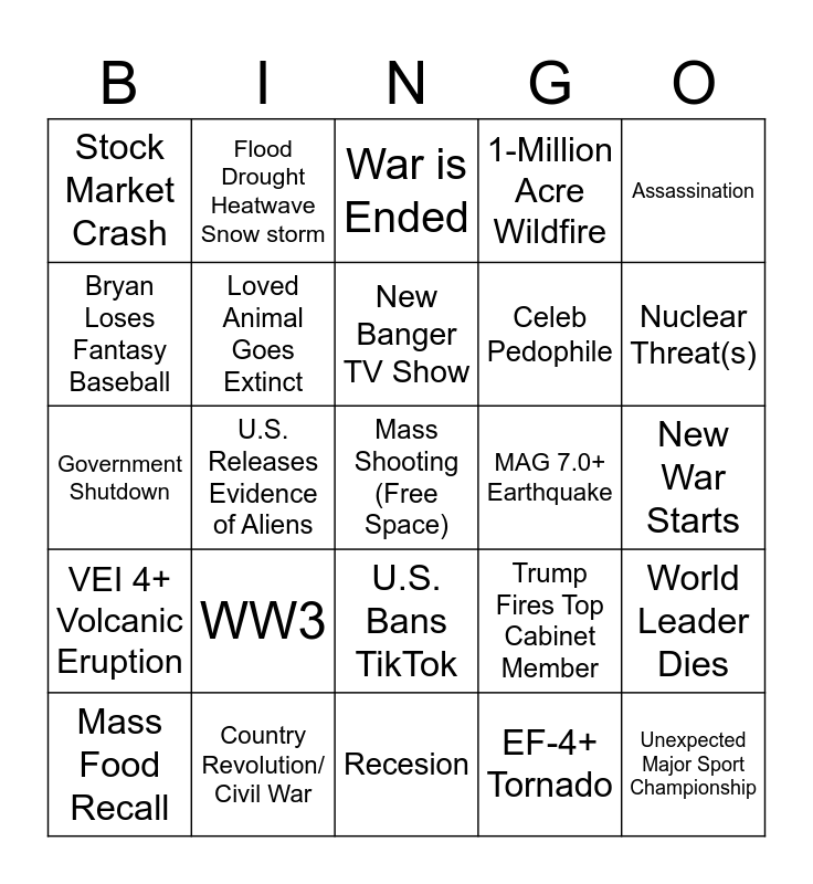 This bingo card has a free space and 30 words: Country Revolution/ Civil War, New Pandemic, U.S. Releases Evidence of Aliens, CAT-4+ Hurricane, Stock Market Crash, War is Ended, Loved Animal Goes Extinct, U.S. Bans TikTok, MAG 7.0+ Earthquake, Recesion, New War Starts, Unexpected Major Sport Championship, EF-4+ Tornado, Mass Protest in US, Nuclear Threat(s), Celebrity says N-Word on TV, Trump Fires Top Cabinet Member, VEI 4+ Volcanic Eruption, WW3, Assassination, Government Shutdown, New Pope, Flood Drought Heatwave Snow storm, Celeb Pedophile, Bryan Loses Fantasy Baseball, 1-Million Acre Wildfire, World Leader Dies, Mass Food Recall, New Banger TV Show and Superhero.
