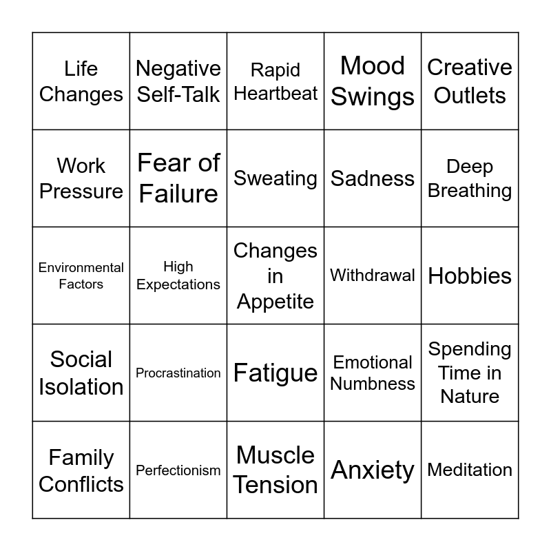 This bingo card has 50 words: Time Constraints, Perfectionism, Nervous Habits, Irritability, Hobbies, Global Events, Negative Self-Talk, Shortness of Breath, Sadness, Yoga, Life Changes, Fear of Failure, Changes in Appetite, Anxiety, Mindfulness, Health Crisis, High Expectations, Sweating, Anger, Creative Outlets, Environmental Factors, Self-Doubt, Rapid Heartbeat, Withdrawal, Talking to Friends, Social Isolation, Procrastination, Digestive Issues, Mood Swings, Spending Time in Nature, Relationship Issues, Overthinking, Sleep Disturbances, Lack of Motivation, Journaling, Family Conflicts, Guilt, Muscle Tension, Overreacting, Deep Breathing, Financial Worries, Low Self-Esteem, Fatigue, Crying Spells, Meditation, Work Pressure, Unresolved Trauma, Headaches, Emotional Numbness and Exercise.