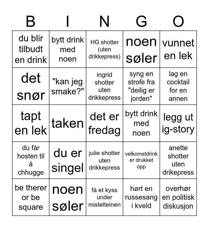 This bingo card has a free space and 29 words: be therer or be square, katinka taper nose goes, taken, loveshot med din lover du blir tilbudt en, du blir tilbudt en drink, HG shotter (uten drikkepress), "kan jeg smake?", du er singel, bytt drink med noen, noen søler, legg ut ig-story, overhør en politisk diskusjon, få et kyss under mistelteinen, hørt en russesang i kveld, lag en cocktail for en annen, hold noen i hånden i 5 min, julie shotter uten drikkepress, du får hosten til å chhugge, vunnet en lek, tapt en lek, velkomstdrink er drukket opp, snowman av sia spilles, syng en strofe fra "deilig er jorden", det snør, noen søler, bytt drink med noen, anette shotter uten drikepress, ingrid shotter uten drikkepress and katinka shotter uten drikkepress.