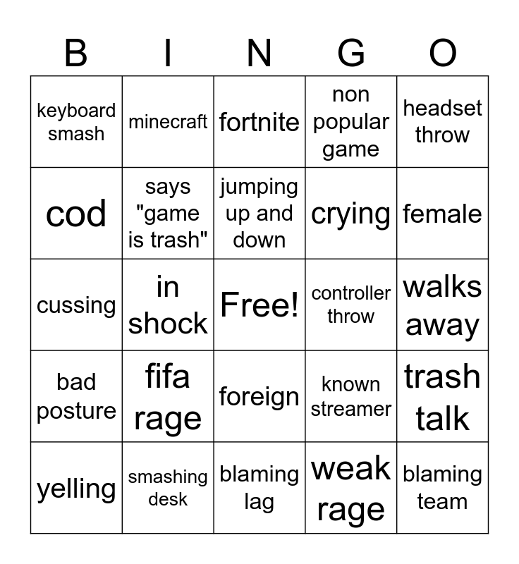 This bingo card has a free space and 24 words: fifa rage, smashing desk, jumping up and down, yelling, headset throw, keyboard smash, cod, minecraft, controller throw, foreign, crying, cussing, known streamer, trash talk, says "game is trash", weak rage, walks away, fortnite, female, in shock, blaming team, bad posture, non popular game and blaming lag.