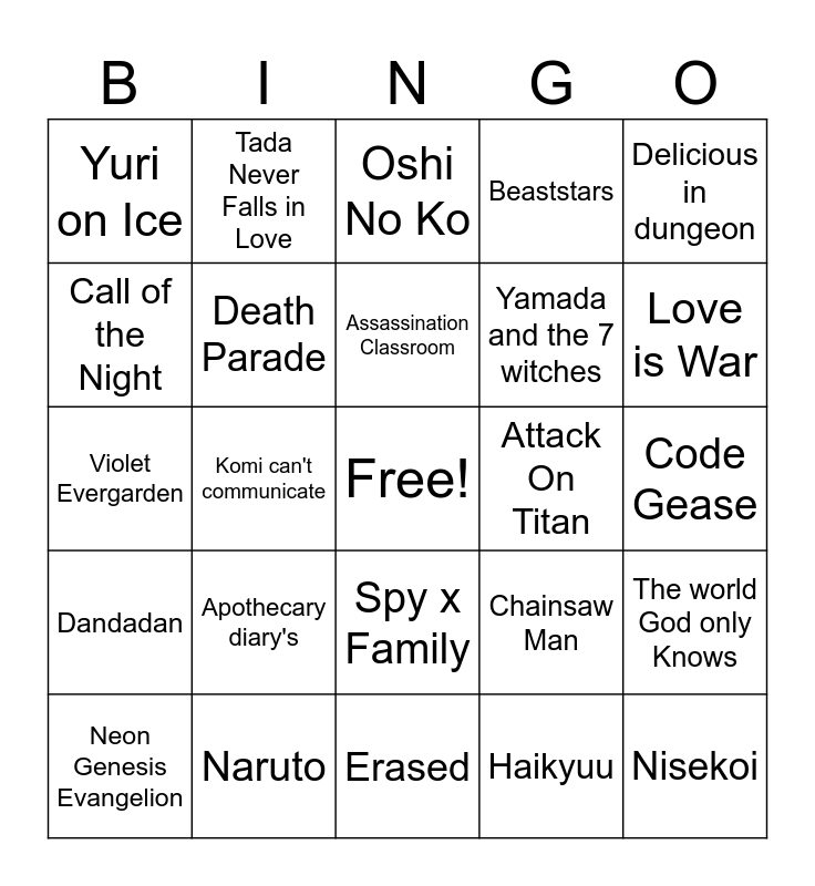 This bingo card has a free space and 30 words: Naruto, Vinland Saga, Komi can't communicate, Horimiya, Yuri on Ice, Oshi No Ko, Death Parade, Spy x Family, Attack On Titan, Erased, Code Gease, Nisekoi, Haikyuu, Your Lie in April, Love is War, Jojo, Chainsaw Man, Dandadan, Apothecary diary's, Delicious in dungeon, Violet Evergarden, Anohana, Tada Never Falls in Love, Yamada and the 7 witches, Call of the Night, Beaststars, The world God only Knows, Neon Genesis Evangelion, Assassination Classroom and Yugioh.