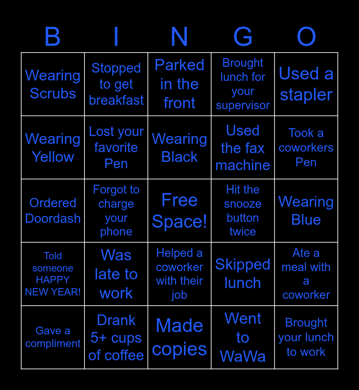 This bingo card has a free space and 24 words: Was late to work, Drank 5+ cups of coffee, Wearing Black, Gave a compliment, Used a stapler, Wearing Scrubs, Wearing Yellow, Stopped to get breakfast, Hit the snooze button twice, Helped a coworker with their job, Used the fax machine, Ordered Doordash, Skipped lunch, Ate a meal with a coworker, Lost your favorite Pen, Went to WaWa, Wearing Blue, Parked in the front, Took a coworkers Pen, Forgot to charge your phone, Brought your lunch to work, Told someone HAPPY NEW YEAR!, Brought lunch for your supervisor and Made copies.