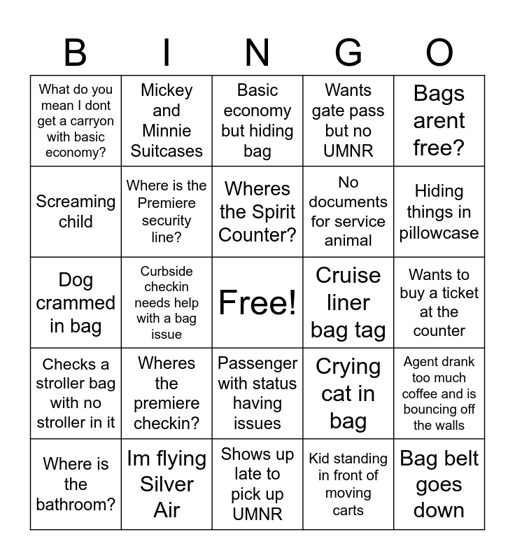 This bingo card has a free space and 24 words: Wheres the premiere checkin?, Im flying Silver Air, Wheres the Spirit Counter?, Where is the bathroom?, Bags arent free?, What do you mean I dont get a carryon with basic economy?, Screaming child, Mickey and Minnie Suitcases, Cruise liner bag tag, Passenger with status having issues, No documents for service animal, Dog crammed in bag, Crying cat in bag, Agent drank too much coffee and is bouncing off the walls, Where is the Premiere security line?, Kid standing in front of moving carts, Wants to buy a ticket at the counter, Basic economy but hiding bag, Hiding things in pillowcase, Curbside checkin needs help with a bag issue, Bag belt goes down, Checks a stroller bag with no stroller in it, Wants gate pass but no UMNR and Shows up late to pick up UMNR.