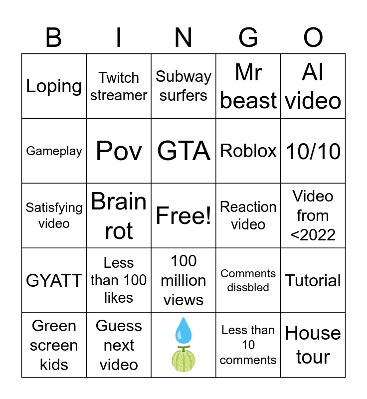 This bingo card has a free space and 24 words: Less than 100 likes, Guess next video, GTA, Green screen kids, AI video, Loping, Gameplay, Twitch streamer, Reaction video, 100 million views, Roblox, Satisfying video, Comments dissbled, Tutorial, Pov, Less than 10 comments, Video from <2022, Subway surfers, 10/10, Brain rot, House tour, GYATT, Mr beast and 💧🍈.