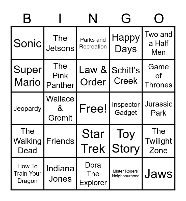 This bingo card has a free space and 39 words: Spongebob SquarePants, Doctor Who, Frasier, The Pink Panther, How To Train Your Dragon, Star Trek, Law & Order, Men In Black, Two and a Half Men, The Walking Dead, Wallace & Gromit, Happy Days, Jaws, Jurassic Park, Inspector Gadget, Friends, Mission Impossible, Sonic, The Golden Girls, Toy Story, Super Mario, Dora The Explorer, Schitt’s Creek, Game of Thrones, Fraggle Rock, Murdoch Mysteries, Shameless, M.A.S.H, The Office, The Jetsons, Family Guy, Bob’s Burgers, Parks and Recreation, Indiana Jones, Mister Rogers’ Neighbourhood, Buffy The Vampire Slayer, The Twilight Zone, Jeopardy and VeggieTales.