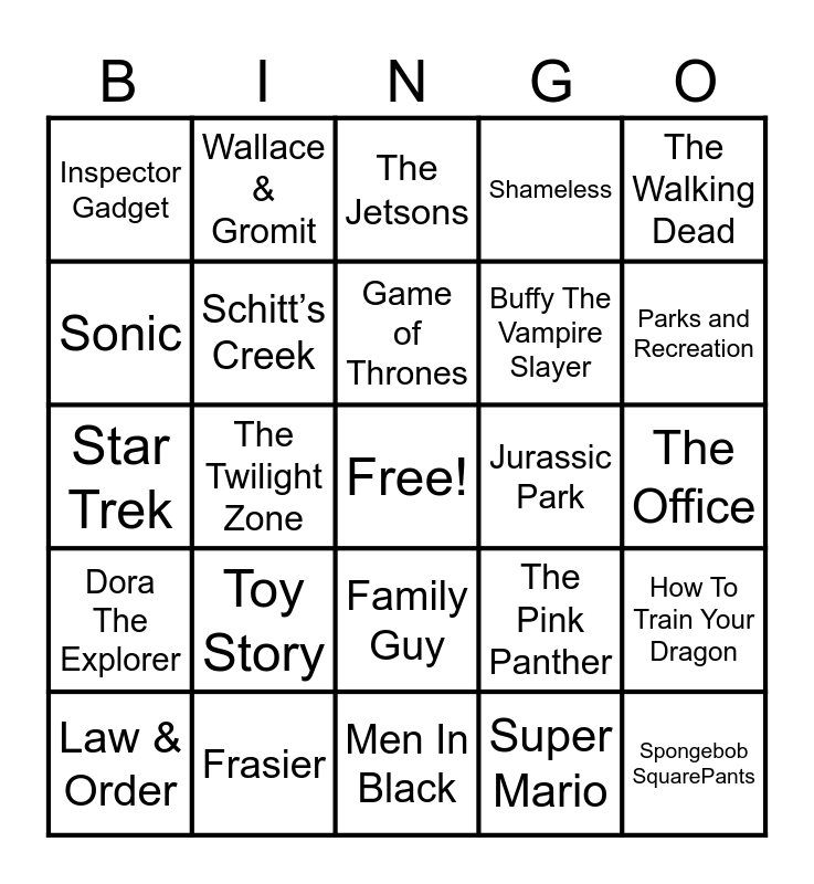 This bingo card has a free space and 39 words: Jeopardy, Indiana Jones, M.A.S.H, Schitt’s Creek, Law & Order, Family Guy, Game of Thrones, Friends, The Walking Dead, Dora The Explorer, The Twilight Zone, Shameless, Spongebob SquarePants, The Office, Jurassic Park, Toy Story, Murdoch Mysteries, Inspector Gadget, Two and a Half Men, The Pink Panther, Sonic, Men In Black, Buffy The Vampire Slayer, Parks and Recreation, The Golden Girls, Doctor Who, Happy Days, Fraggle Rock, VeggieTales, Wallace & Gromit, Mister Rogers’ Neighbourhood, Jaws, The Jetsons, Frasier, Super Mario, Mission Impossible, How To Train Your Dragon, Star Trek and Bob’s Burgers.