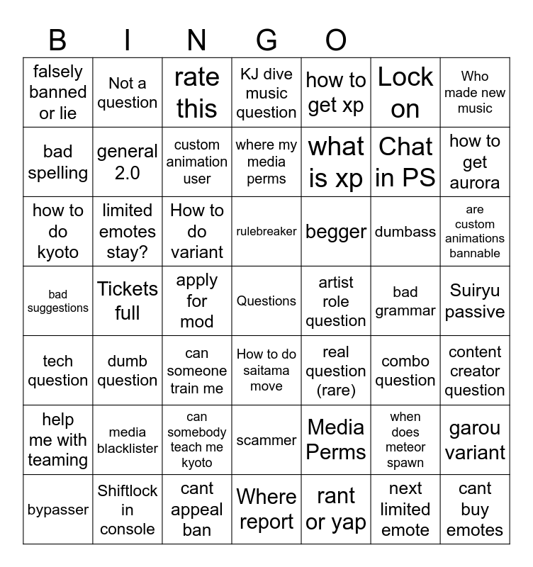 This bingo card has a free space and 48 words: Media Perms, Chat in PS, Where report, Tickets full, How to do variant, Suiryu passive, Not a question, Shiftlock in console, Lock on, How to do saitama move, Who made new music, KJ dive music question, dumbass, begger, help me with teaming, bad grammar, bad spelling, how to get aurora, when does meteor spawn, how to get xp, what is xp, apply for mod, falsely banned or lie, general 2.0, garou variant, custom animation user, are custom animations bannable, bypasser, rulebreaker, limited emotes stay?, next limited emote, artist role question, content creator question, media blacklister, bad suggestions, real question (rare), combo question, how to do kyoto, can someone train me, can somebody teach me kyoto, tech question, cant buy emotes, rate this, cant appeal ban, where my media perms, scammer, dumb question and rant or yap.