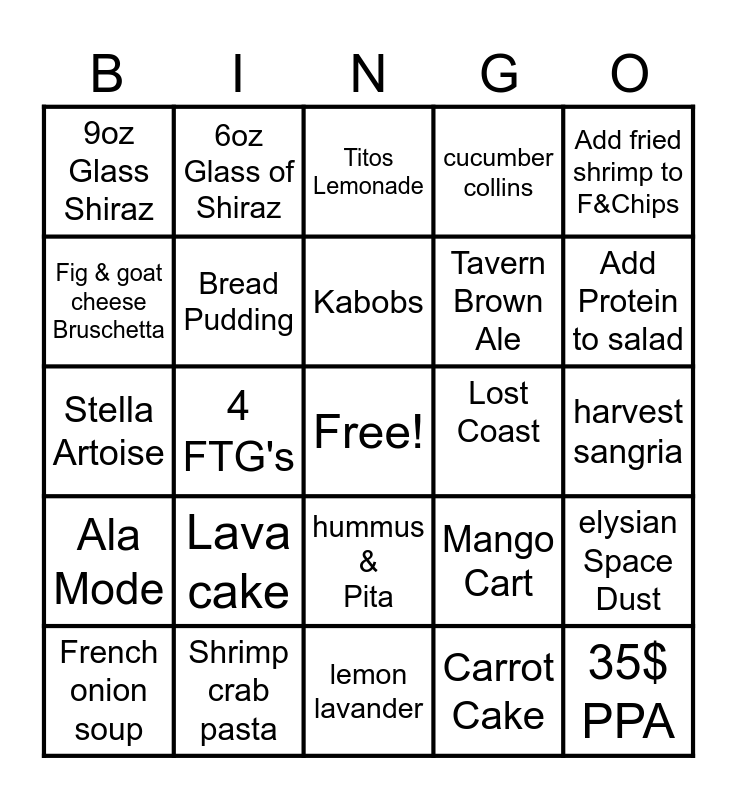 This bingo card has a free space and 24 words: Lava cake, Shrimp crab pasta, Kabobs, French onion soup, Add fried shrimp to F&Chips, 9oz Glass Shiraz, Fig & goat cheese Bruschetta, 6oz Glass of Shiraz, Lost Coast, hummus & Pita, Tavern Brown Ale, Stella Artoise, Mango Cart, elysian Space Dust, Bread Pudding, Carrot Cake, harvest sangria, Titos Lemonade, Add Protein to salad, 4 FTG's, 35$ PPA, Ala Mode, cucumber collins and lemon lavander.