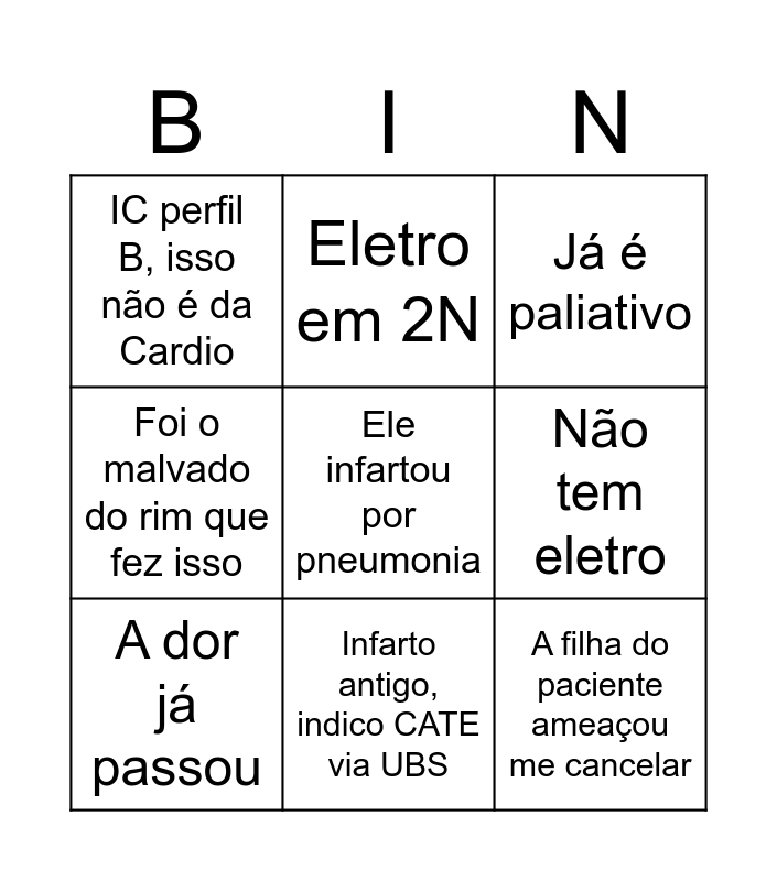 This bingo card has a free space and 8 words: Não tem eletro, Já é paliativo, Eletro em 2N, A dor já passou, IC perfil B, isso não é da Cardio, A filha do paciente ameaçou me cancelar, Foi o malvado do rim que fez isso and Infarto antigo, indico CATE via UBS.