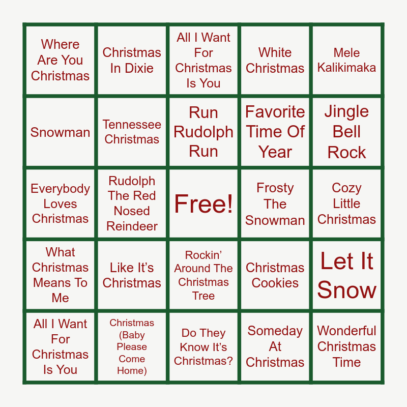 This bingo card has a free space and 50 words: Santa Claus Is Comin’ It’s Christmas Time, Wonderful Christmas Time, You Make It Feel Like Christmas, Do They Know It’s Christmas?, Like It’s Christmas, Candy Cane Lane, Christmas In Dixie, Sleigh Ride, Snowman, Merry Christmas From The Family, Tennessee Christmas, White Christmas, Let It Snow, Christmas Cookies, Pick Out A Christmas Tree, Christmas Magic, Run Rudolph Run, Frosty The Snowman, You’re A Mean One, Mr. Grinch, Mele Kalikimaka, Rudolph The Red Nosed Reindeer, Someday At Christmas, Where Are You Christmas, Favorite Time Of Year, Baby, It’s Cold Outside, Santa Claws Is Coming To Town, Jingle Bell Rock, Kidnap The Sandy Claws, All I Want For Christmas Is You, Rockin’ Around The Christmas Tree, Last Christmas, A Holly Jolly Christmas, Underneath The Tree, It’s Beginning To Look A Lot Like Christmas, Christmas (Baby Please Come Home), Santa Baby, Blue Christmas, Hard Candy Christmas, Please Come Home For Christmas, Cozy Little Christmas, Santa Tell Me, Snow In California, Christmas Isn’t Canceled (Just You), Mistletoe, All I Want For Christmas Is You, Everybody Loves Christmas, Shake Up Christmas, This Christmas, What Christmas Means To Me and Baby It’s Cold Outside (feat. Meghan Trainor).