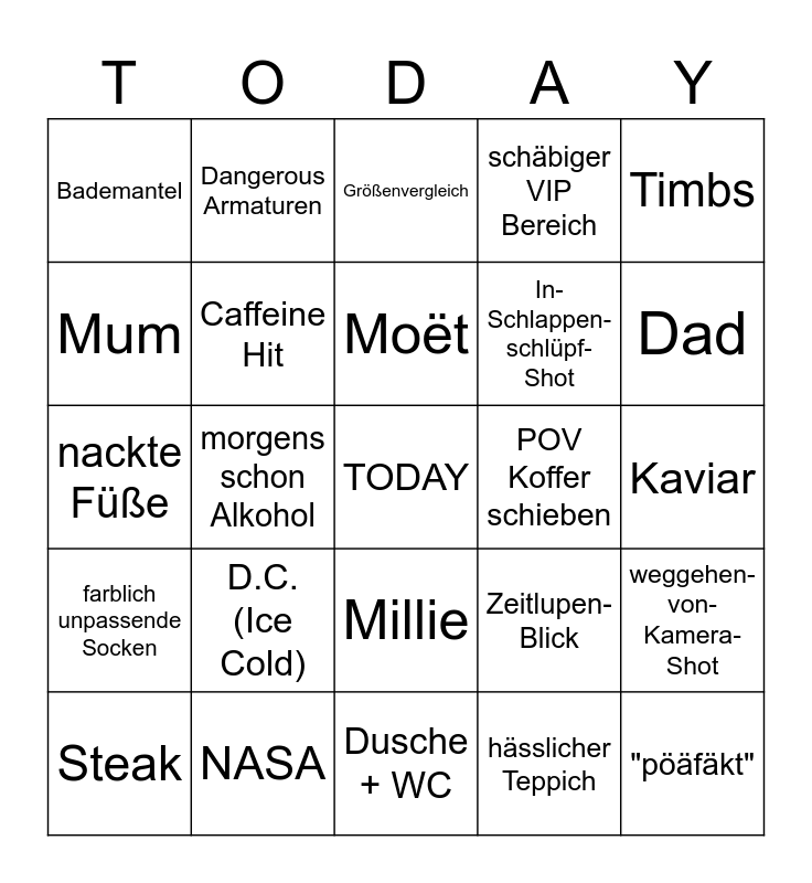 This bingo card has a free space and 24 words: D.C. (Ice Cold), NASA, Moët, Steak, Timbs, Bademantel, Mum, Dangerous Armaturen, POV Koffer schieben, Millie, In-Schlappen-schlüpf-Shot, nackte Füße, Zeitlupen-Blick, weggehen-von-Kamera-Shot, Caffeine Hit, hässlicher Teppich, Kaviar, Größenvergleich, Dad, morgens schon Alkohol, "pöäfäkt", farblich unpassende Socken, schäbiger VIP Bereich and Dusche + WC.
