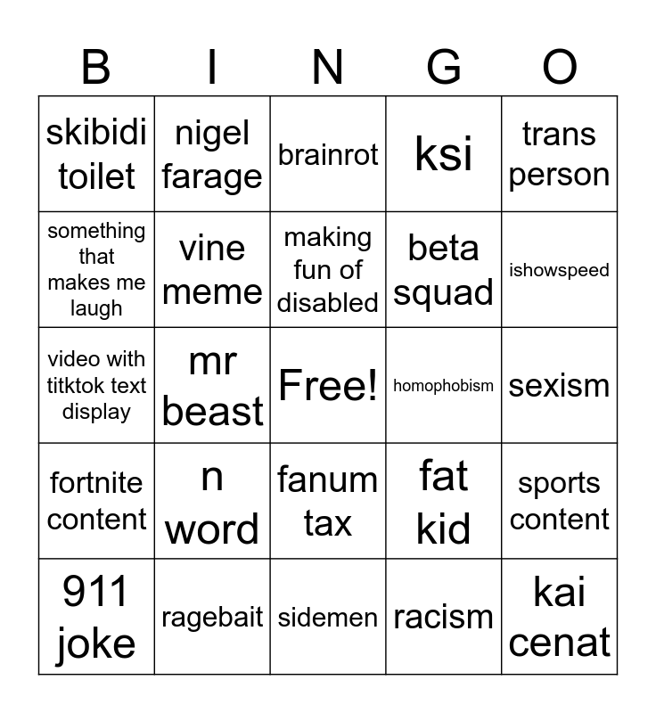 This bingo card has a free space and 24 words: 911 joke, n word, making fun of disabled, racism, trans person, skibidi toilet, nigel farage, brainrot, homophobism, sexism, video with titktok text display, vine meme, fat kid, sports content, something that makes me laugh, ragebait, sidemen, ksi, ishowspeed, fortnite content, mr beast, fanum tax, beta squad and kai cenat.