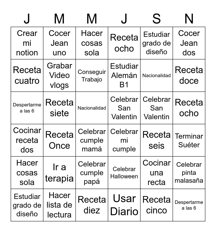 This bingo card has 73 words: Cocinar una recta, Hacer lista de lectura, Crear mi notion, Despertarme a las 6, Usar Diario, Terminar Suéter, Celebrar San Valentin, Hacer mi portafolio, Cocinar receta dos, Recerta tres, Hacer cosas sola, Celebrar pinta malasaña, Receta cuatro, Nacionalidad, Receta cinco, Cocer Jean uno, Receta seis, Cocer Jean dos, Celebrar cumple papá, Receta siete, Grabar Video vlogs, Receta ocho, Estudiar grado de diseño, Ir a terapia, Celebrar cumple mamá, Receta nueve, Estudiar Alemán B1, Celebrar Halloween, Receta diez, Ahorrar 100 E, Celebrar mi cumple, Receta Once, Libro de poesia por edades, Celebrar Navidad, Receta doce, Cocinar una recta, Hacer lista de lectura, Crear mi notion, Despertarme a las 6, Usar Diario, Terminar Suéter, Celebrar San Valentin, Hacer mi portafolio, Cocinar receta dos, Recerta tres, Conseguir Trabajo, Hacer cosas sola, Celebrar pinta malasaña, Receta cuatro, Nacionalidad, Receta cinco, Cocer Jean uno, Receta seis, Cocer Jean dos, Celebrar cumple papá, Receta siete, Grabar Video vlogs, Receta ocho, Estudiar grado de diseño, Ir a terapia, Celebrar cumple mamá, Receta nueve, Hacer un Amigo nuevo, Estudiar Alemán B1, Celebrar Halloween, Receta diez, Ahorrar 100 E, Celebrar mi cumple, Receta Once, Ir a una cita, Libro de poesia por edades, Celebrar Navidad and Receta doce.