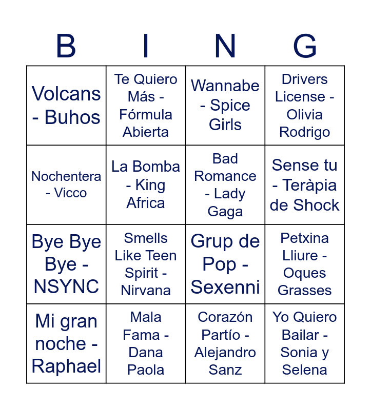 This bingo card has 100 words: Geografía - La Oreja de Van Gogh, La Playa - La Oreja de Van Gogh, Corazón Partío - Alejandro Sanz, Vino tinto - Estopa, La raja de tu falda - Estopa, Marta, Sebas, Guille y los demás - Amaral, Tu jardín con enanitos - Melendi, Ave María - David Bisbal, Cuando tú vas - Chenoa, Que la detengan - David Civera, Dos hombres y un destino - Bustamante, Zapatillas - El Canto del Loco, Ella - Bebe, Propuesta Indecente - Romeo Santos, Trepitja Fort - Lax’n’Busto, Obsesión - Aventura, Bye Bye Bye - NSYNC, Livin’ on a Prayer - Bon Jovi, Fiesta Pagana - Mägo de Oz, Oops! I did it again - Britney Spears, La Bilirubina - Diomedes Nuñez, Surfin’ U.S.A. - The Beach Boys, Copacabana - Izal, Rasputin - Boney M., Our Place - Maia Vidal, Mala Fama - Dana Paola, Nochentera - Vicco, Coti x Coti - The Tyets, Estaré millor demà - The Tyets/Marlena, Sort de tu - Oques Grasses, Petxina Lliure - Oques Grasses, Volcans - Buhos, In the end - Stay Homas, Supermercat - Lildami, Boig per tu - Sau, Sense tu - Teràpia de Shock, Jo mai mai - Joan Dausà, Músic de Carrer - Txarango, Gat Rumbero - La Pegatina, No som d’aquí - La Pegatina, Comèdia dramàtica - La Fúmiga, La Marina sta morena - Figa Flawas, Grup de Pop - Sexenni, Jean Luc - Els Amics de les Arts, Smells Like Teen Spirit - Nirvana, Wannabe - Spice Girls, I Want It That Way - Backstreet Boys, Ironic - Alanis Morissette, Without Me - Eminem, Single Ladies - Beyoncé, Hips Don’t Lie - Shakira, Ciega, Sordomuda - Shakira, El Sol No Regresa - La Quinta Estación, Rolling in the Deep - Adele, Shape of You - Ed Sheeran, Flowers - Miley Cyrus, Wrecking Ball - Miley Cyrus, New Rules - Dua Lipa, Blinding Lights - The Weekend, Drivers License - Olivia Rodrigo, Tití Me Preguntó - Bad Bunny, Woman - Doja Cat, Dynamite - BTS, Love Story - Taylor Swift, Cruel Summer - Taylor Swift, Sk8er Boi - Avril Lavigne, El Vals del Obrero - Ska-P, Milionària - Rosalía, Despechá - Rosalía, Chulo - Bad Gyal, Torero - Chayanne, I Kissed a Girl - Katy Perry, Umbrella - Rihanna, Ay Mamá - Rigoberta Bandini, Zorra - Nebulosa, Mamma Mia - ABBA, Se Me Olvidó Tu Nombre - Shalim, La Bomba - King Africa, Entre Poetas y Presos - La Raíz, Purpurina - Alberto Gambino, Cuando Zarpa el Amor - Camela, Mi gran noche - Raphael, Una Vaina Loca - Fuego, Amigos Para Siempre - Los Manolos, Mentirosa - Rafaga, Te Quiero Más - Fórmula Abierta, Que la Detengan - David Civera, Gasolina - Daddy Yankee, Barbie Girl - Aqua, Yo Quiero Bailar - Sonia y Selena, All About That Bass - Meghan Trainor, Stitches - Shawn Mendes, Cool for the Summer - Demi Lovato, Believer - Imagine Dragons, Bad Romance - Lady Gaga, La Revolución Sexual - La Casa Azul, Dragostea Din Tei - O-Zone, Wolves - Selena Gomez, Try - P!nk and Eye of the Tiger - Survivor.