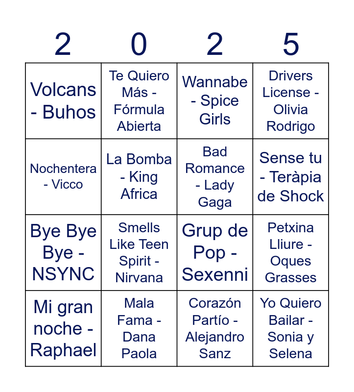This bingo card has 100 words: Geografía - La Oreja de Van Gogh, La Playa - La Oreja de Van Gogh, Corazón Partío - Alejandro Sanz, Vino tinto - Estopa, La raja de tu falda - Estopa, Marta, Sebas, Guille y los demás - Amaral, Tu jardín con enanitos - Melendi, Ave María - David Bisbal, Cuando tú vas - Chenoa, Que la detengan - David Civera, Dos hombres y un destino - Bustamante, Zapatillas - El Canto del Loco, Ella - Bebe, Propuesta Indecente - Romeo Santos, Trepitja Fort - Lax’n’Busto, Obsesión - Aventura, Bye Bye Bye - NSYNC, Livin’ on a Prayer - Bon Jovi, Fiesta Pagana - Mägo de Oz, Oops! I did it again - Britney Spears, La Bilirubina - Diomedes Nuñez, Surfin’ U.S.A. - The Beach Boys, Copacabana - Izal, Rasputin - Boney M., Our Place - Maia Vidal, Mala Fama - Dana Paola, Nochentera - Vicco, Coti x Coti - The Tyets, Estaré millor demà - The Tyets/Marlena, Sort de tu - Oques Grasses, Petxina Lliure - Oques Grasses, Volcans - Buhos, In the end - Stay Homas, Supermercat - Lildami, Boig per tu - Sau, Sense tu - Teràpia de Shock, Jo mai mai - Joan Dausà, Músic de Carrer - Txarango, Gat Rumbero - La Pegatina, No som d’aquí - La Pegatina, Comèdia dramàtica - La Fúmiga, La Marina sta morena - Figa Flawas, Grup de Pop - Sexenni, Jean Luc - Els Amics de les Arts, Smells Like Teen Spirit - Nirvana, Wannabe - Spice Girls, I Want It That Way - Backstreet Boys, Ironic - Alanis Morissette, Without Me - Eminem, Single Ladies - Beyoncé, Hips Don’t Lie - Shakira, Ciega, Sordomuda - Shakira, El Sol No Regresa - La Quinta Estación, Rolling in the Deep - Adele, Shape of You - Ed Sheeran, Flowers - Miley Cyrus, Wrecking Ball - Miley Cyrus, New Rules - Dua Lipa, Blinding Lights - The Weekend, Drivers License - Olivia Rodrigo, Tití Me Preguntó - Bad Bunny, Woman - Doja Cat, Dynamite - BTS, Love Story - Taylor Swift, Cruel Summer - Taylor Swift, Sk8er Boi - Avril Lavigne, El Vals del Obrero - Ska-P, Milionària - Rosalía, Despechá - Rosalía, Chulo - Bad Gyal, Torero - Chayanne, I Kissed a Girl - Katy Perry, Umbrella - Rihanna, Ay Mamá - Rigoberta Bandini, Zorra - Nebulosa, Mamma Mia - ABBA, Se Me Olvidó Tu Nombre - Shalim, La Bomba - King Africa, Entre Poetas y Presos - La Raíz, Purpurina - Alberto Gambino, Cuando Zarpa el Amor - Camela, Mi gran noche - Raphael, Una Vaina Loca - Fuego, Amigos Para Siempre - Los Manolos, Mentirosa - Rafaga, Te Quiero Más - Fórmula Abierta, Que la Detengan - David Civera, Gasolina - Daddy Yankee, Barbie Girl - Aqua, Yo Quiero Bailar - Sonia y Selena, All About That Bass - Meghan Trainor, Stitches - Shawn Mendes, Cool for the Summer - Demi Lovato, Believer - Imagine Dragons, Bad Romance - Lady Gaga, La Revolución Sexual - La Casa Azul, Dragostea Din Tei - O-Zone, Wolves - Selena Gomez, Try - P!nk and Eye of the Tiger - Survivor.