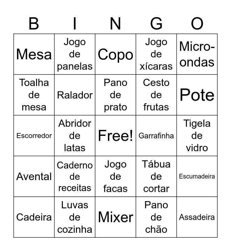 This bingo card has a free space and 77 words: Panela, Prato, Copo, Xícara, Talher, Colher, Garfo, Faca, Tigela, Liquidificador, Batedeira, Coador, Pano de prato, Toalha de mesa, Abridor de garrafa, Abridor de latas, Frigideira, Assadeira, Forno, Micro-ondas, Chaleira, Escorredor, Ralador, Jogo de panelas, Jogo de xícaras, Caneca, Garrafa térmica, Espátula, Colher de pau, Termômetro de cozinha, Saleiro, Pimenteiro, Galheteiro, Tábua de cortar, Pote, Cesto de frutas, Porta-temperos, Rolo de massa, Tigela de vidro, Pano de chão, Escorredor de arroz, Pote hermético, Bule, Vasilha, Coador de café, Pegador de macarrão, Cadeira, Mesa, Cortador de pizza, Timer de cozinha, Pincel de cozinha, Jogo de facas, Forma de bolo, Forma de muffin, Fruteira, Cafeteira, Refratário, Escova de limpeza, Suporte de pratos, Grelha, Caderno de receitas, Tesoura de cozinha, Lixeira, Clipes de saco, Taça, Frasqueira, Porta-copos, Garrafinha, Açucareiro, Porta feijão, Porta farinha, Escumadeira, Avental, Luvas de cozinha, Flanela, Mixer and Manteigueira.