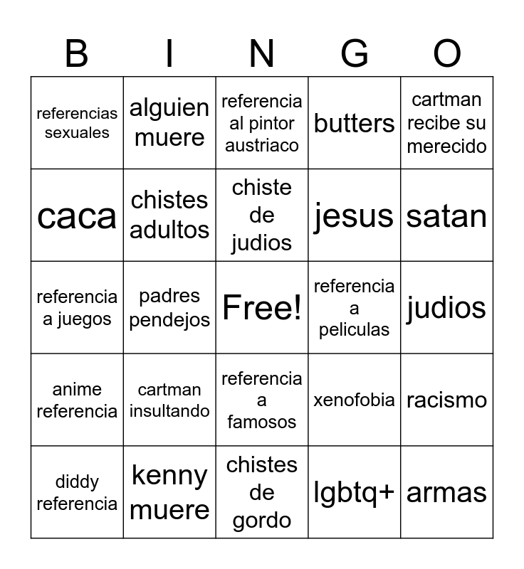This bingo card has a free space and 24 words: cartman insultando, kenny muere, chiste de judios, diddy referencia, cartman recibe su merecido, referencias sexuales, caca, alguien muere, referencia a peliculas, referencia a famosos, jesus, referencia a juegos, xenofobia, racismo, chistes adultos, lgbtq+, judios, referencia al pintor austriaco, satan, padres pendejos, armas, anime referencia, butters and chistes de gordo.