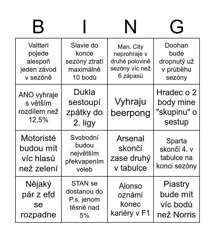This bingo card has 16 words: STAN se dostanou do P.s. jenom těsně nad 5%, Sparta skončí 4. v tabulce na konci sezóny, Man. City neprohraje v druhé polovině sezóny víc než 6 zápasů, Valtteri pojede alespoň jeden závod v sezóně, Motoristé budou mít víc hlasů než zelení, Slavie do konce sezóny ztratí maximálně 10 bodů, Arsenal skončí zase druhý v tabulce, Alonso oznámí konec kariéry v F1, ANO vyhraje s větším rozdílem než 12,5%, Dukla sestoupí zpátky do 2. ligy, Nějaký pár z efd se rozpadne, Doohan bude dropnutý už v průběhu sezóny, Svobodní budou největším překvapením voleb, Hradec o 2 body mine "skupinu" o sestup, Vyhraju beerpong and Piastry bude mít víc bodů než Norris.