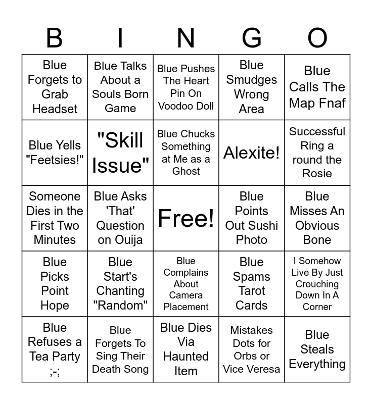 This bingo card has a free space and 24 words: Blue Start's Chanting "Random", Blue Forgets To Sing Their Death Song, Blue Chucks Something at Me as a Ghost, Blue Refuses a Tea Party ;-;, Blue Calls The Map Fnaf, Blue Forgets to Grab Headset, Blue Yells "Feetsies!", Blue Talks About a Souls Born Game, Blue Points Out Sushi Photo, Blue Complains About Camera Placement, Alexite!, Someone Dies in the First Two Minutes, Blue Spams Tarot Cards, I Somehow Live By Just Crouching Down In A Corner, "Skill Issue", Mistakes Dots for Orbs or Vice Veresa, Blue Misses An Obvious Bone, Blue Pushes The Heart Pin On Voodoo Doll, Successful Ring a round the Rosie, Blue Asks 'That' Question on Ouija, Blue Steals Everything, Blue Picks Point Hope, Blue Smudges Wrong Area and Blue Dies Via Haunted Item.