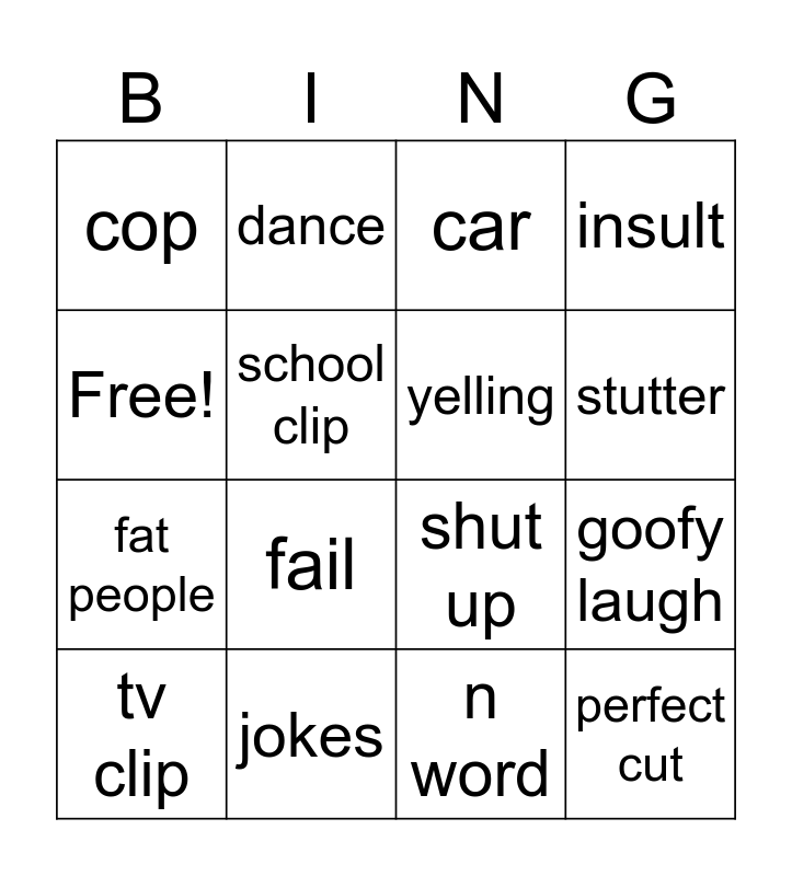This bingo card has 16 words: jokes, goofy laugh, car, cop, fat people, dance, shut up, n word, Free!, school clip, tv clip, insult, fail, stutter, yelling and perfect cut.