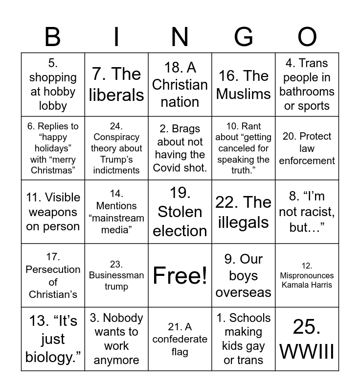 This bingo card has 26 words: Free!, 1. Schools making kids gay or trans, 2. Brags about not having the Covid shot., 3. Nobody wants to work anymore, 4. Trans people in bathrooms or sports, 5. shopping at hobby lobby, 6. Replies to “happy holidays” with “merry Christmas”, 7. The liberals, 8. “I’m not racist, but…”, 9. Our boys overseas, 10. Rant about “getting canceled for speaking the truth.”, 11. Visible weapons on person, 12. Mispronounces Kamala Harris, 13. “It’s just biology.”, 14. Mentions “mainstream media”, 15. The second amendment, 16. The Muslims, 17. Persecution of Christian’s, 18. A Christian nation, 19. Stolen election, 20. Protect law enforcement, 21. A confederate flag, 22. The illegals, 23. Businessman trump, 24. Conspiracy theory about Trump’s indictments and 25. WWIII.
