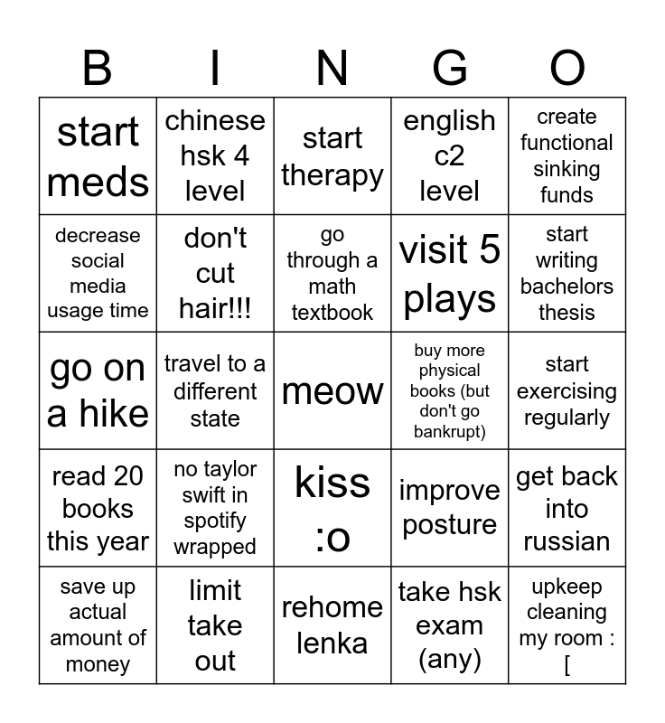 This bingo card has a free space and 29 words: save up actual amount of money, visit janka, travel to a different state, get a better job, start meds, start therapy, don't cut hair!!!, no taylor swift in spotify wrapped, buy more physical books (but don't go bankrupt), limit take out, start exercising regularly, upkeep cleaning my room :[, rehome lenka, take hsk exam (any), start writing bachelors thesis, start painting and drawing again, kiss :o, read 20 books this year, create functional sinking funds, go on a hike, improve posture, join a dnd party, visit 5 plays, decrease social media usage time, english c2 level, chinese hsk 4 level, get back into russian, go through a math textbook and get a meeting with a career advisor.
