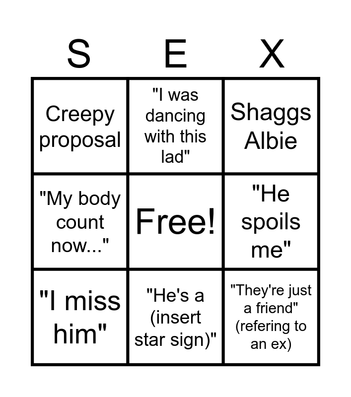 This bingo card has a free space and 17 words: "We're working it out", Goes back to an ex, Shaggs Albie, Creepy proposal, "I shagged him", "My body count now...", "I need a woman", "I miss him", "He's a (insert star sign)", "He spoils me", "he's literally me", "Just got bored of him", "They're just a friend"(refering to an ex), "I was dancing with this lad", "they wanted something more", "I don't want a relationship rn" and Didn't pass the vibe check.