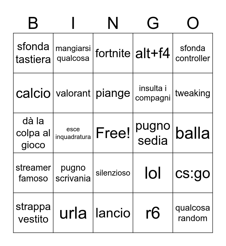 This bingo card has a free space and 24 words: pugno scrivania, urla, piange, strappa vestito, sfonda controller, sfonda tastiera, calcio, mangiarsi qualcosa, pugno sedia, silenzioso, insulta i compagni, dà la colpa al gioco, lol, cs:go, valorant, r6, balla, fortnite, tweaking, esce inquadratura, qualcosa random, streamer famoso, alt+f4 and lancio.