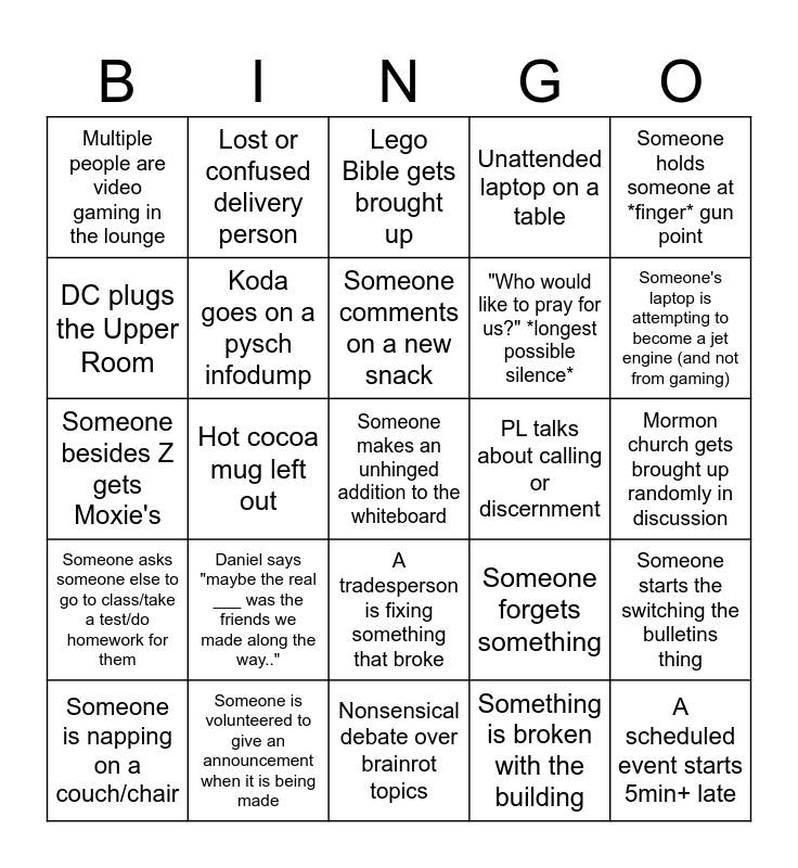 This bingo card has a free space and 24 words: Daniel says "maybe the real ___ was the friends we made along the way..", Someone is volunteered to give an announcement when it is being made, Someone comments on a new snack, Someone is napping on a couch/chair, Someone holds someone at *finger* gun point, Multiple people are video gaming in the lounge, DC plugs the Upper Room, Lost or confused delivery person, PL talks about calling or discernment, A tradesperson is fixing something that broke, "Who would like to pray for us?" *longest possible silence*, Someone besides Z gets Moxie's, Someone forgets something, Someone starts the switching the bulletins thing, Koda goes on a pysch infodump, Something is broken with the building, Mormon church gets brought up randomly in discussion, Lego Bible gets brought up, Someone's laptop is attempting to become a jet engine (and not from gaming), Hot cocoa mug left out, A scheduled event starts 5min+ late, Someone asks someone else to go to class/take a test/do homework for them, Unattended laptop on a table and Nonsensical debate over brainrot topics.
