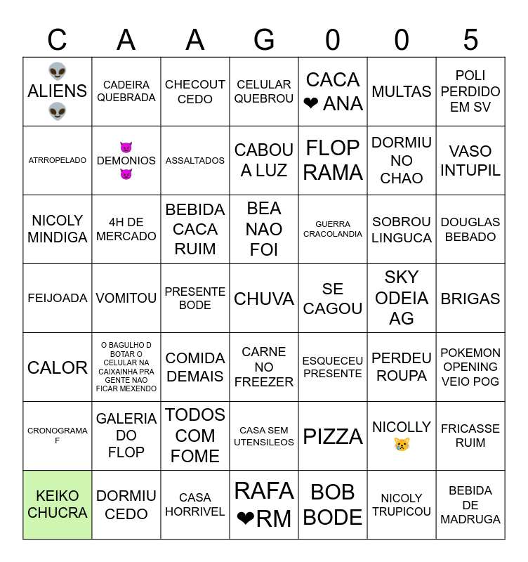 This bingo card has 49 words: NICOLLY 😿, DORMIU NO CHAO, BOB BODE, VOMITOU, BEBIDA CACA RUIM, BRIGAS, CADEIRA QUEBRADA, CASA HORRIVEL, MULTAS, CARNE NO FREEZER, POLI PERDIDO EM SV, CELULAR QUEBROU, SOBROU LINGUCA, GUERRA CRACOLANDIA, GALERIA DO FLOP, SKY ODEIA AG, ATRROPELADO, VASO INTUPIL, FRICASSE RUIM, CACA ❤ ANA, FLOP RAMA, PRESENTE BODE, 👽ALIENS👽, 👿DEMONIOS👿, KEIKO CHUCRA, ASSALTADOS, DOUGLAS BEBADO, DORMIU CEDO, BEA NAO FOI, 4H DE MERCADO, BEBIDA DE MADRUGA, SE CAGOU, CRONOGRAMA F, TODOS COM FOME, FEIJOADA, ESQUECEU PRESENTE, PERDEU ROUPA, POKEMON OPENING VEIO POG, NICOLY MINDIGA, COMIDA DEMAIS, CASA SEM UTENSILEOS, CALOR, CHUVA, RAFA ❤RM, CABOU A LUZ, CHECOUT CEDO, PIZZA, O BAGULHO D BOTAR O CELULAR NA CAIXAINHA PRA GENTE NAO FICAR MEXENDO and NICOLY TRUPICOU.