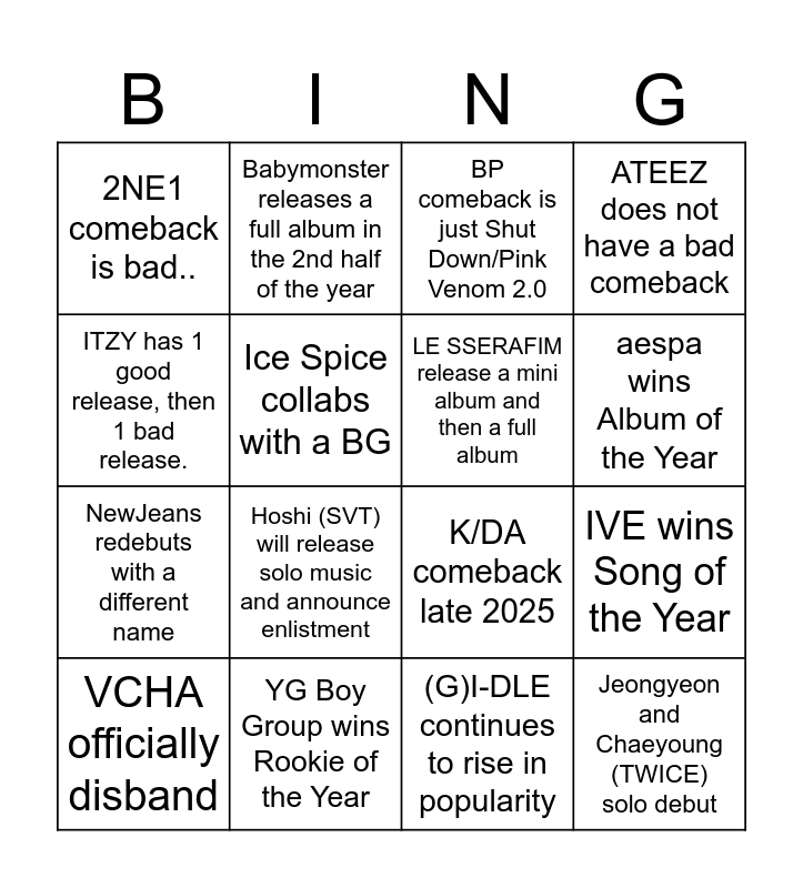 This bingo card has 16 words: YG Boy Group wins Rookie of the Year, IVE wins Song of the Year, BP comeback is just Shut Down/Pink Venom 2.0, 2NE1 comeback is bad.., NewJeans redebuts with a different name, Babymonster releases a full album in the 2nd half of the year, K/DA comeback late 2025, (G)I-DLE continues to rise in popularity, ITZY has 1 good release, then 1 bad release., Ice Spice collabs with a BG, VCHA officially disband, ATEEZ does not have a bad comeback, Hoshi (SVT) will release solo music and announce enlistment, aespa wins Album of the Year, LE SSERAFIM release a mini album and then a full album and Jeongyeon and Chaeyoung (TWICE) solo debut.