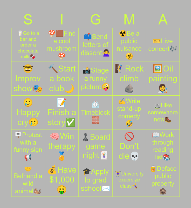 This bingo card has 25 words: 🧠Win therapy🏅, 🎓Apply to grad school✉️, 📸Stage a funny picture🤪, 🤝Befriend a wild animal🐿️, 🎫Live concert🎶, 🥛Go to a bar and order a chocolate milk🍫, 🤓Improv show🎭, 🍄🟫Find a cool mushroom 🍄, ✍️Write stand-up comedy🤣, ♟️Board game night🃏, 🧗♀️Rock climb🪨, 🥲Happy cry🥲, 🚫Don’t die💀, 📖Work through reading list📚, 🔨Start a book club🌙, 🥫Deface public property🏚️, ⛰️Hike somewhere new🥾, 📫Send letters of dissent🙅♀️, 🖼️Oil painting👩🎨, 📝Finish a story✅, ⏲️Timeblock🧱, 💰Have $1,000🤑, 🪧Protest with a funny sign📢, ☢️Be a public nuisance ☣️ and 🏋️♀️University excersize class🤸♀️.