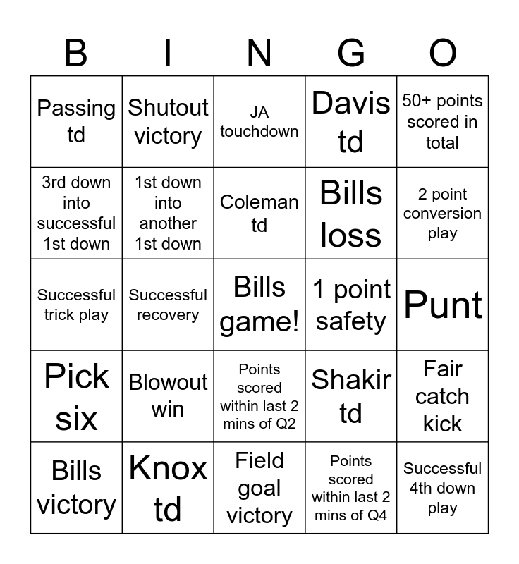 This bingo card has a free space and 84 words: 40+ yard field goal, Overtime, JA touchdown, Cook touchdown, Scoring in back to back drives, Defensive touchdown, 30 yard or under field goal, Field goal is GOOD, 3 & out, 2 point safety, Interception, Running td, 1st down into another 1st down, 1 point safety, Turnover, Passing td, Bills victory, 3rd down into successful 1st down, Backup QB appearance, Fumble, Receiving td, Bills loss, Successful 4th down play, Breaking of NFL record, Successful recovery, 3 tds or more, Breaking of franchise record, 14 or more points by Q1, Up by 2 tds at halftime, Win by 2 tds or more, Blowout win, One score win, JA running td, Successful trick play, Score in under a minute, Comeback victory, Field goal victory, Every Bass kick successful, 2 point conversion play, Pick six, Penalty for 15 yards, Successful deep throw, Successful sack, On side kick, 30+ points scored by Bills, Special teams touchdown, Shutout victory, Victory by touchdown, Game kneel, Hamlin td, Kincaid td, Shakir td, Davis td, Johnson td, Cooper td, Hollins td, Knox td, Coleman td, Recovery (if we fumble and retain ball possession), Punt, Unusual penalty call, Hilarious mistake by opposing team, “Crazy moment”, 40+ points scored by Bills, Scorigami, Halftime scorigami, Play described as “excellent”, 50+ points scored by Bills, 50+ points scored in total, Challenge, Fair catch kick, Weather game, 4th & 1/2, 4th & 4 / 3rd & 3 / 2nd & 2, Points scored within last 2 mins of Q2, Points scored within last 2 mins of Q4, Timeout in Q1 / Q3, Deep touchdown, Running TD over 25 yards, Passing TD over 25 yards, TD with Trubisky in play, 2 timeouts left by end of Q2, Game winning interception and Garbage time game.